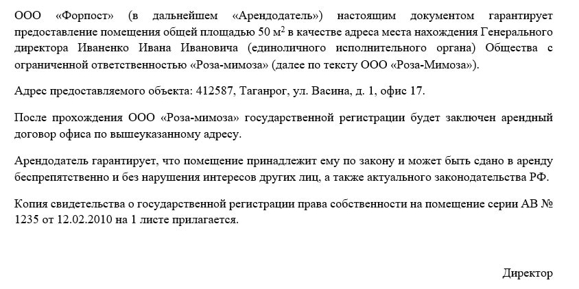 Интересно, что собственник нежилого помещения вправе выдать себе гарантийное письмо, если он выступает учредителем ООО и желает использовать принадлежащее ему помещение в качестве юридического адреса. Такое письмо оформляется как поручительство по аренде, данное юридическому лицу физическим лицом.