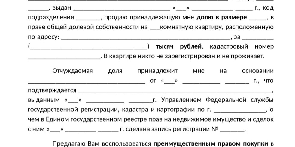 Извещение о продаже доли в квартире: образец