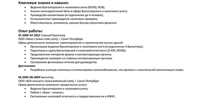 Опыт работы – ключевой элемент резюме. Его нужно описать тщательно и подробно. Для претендента на должность главного бухгалтера обязателен опыт работы не только рядовым бухгалтером, но и менеджером. На примере обязанностей главного бухгалтера для резюме следует кратко сформулировать по каждому месту работы, чем вы занимались и что входило в вашу компетенцию. Также стоит упомянуть достижения и заслуги. Раздел в документе пишется в таком порядке: