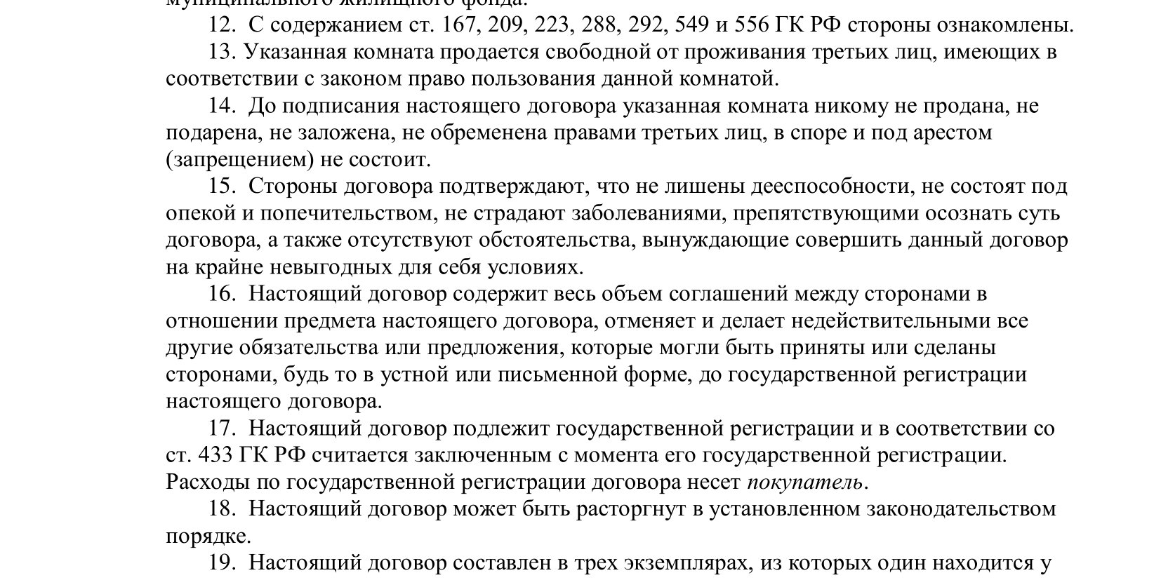 Письменная сделка дарения комнаты в коммунальной квартире не будет иметь силы, если стороны не договорятся о ее существенных условиях.