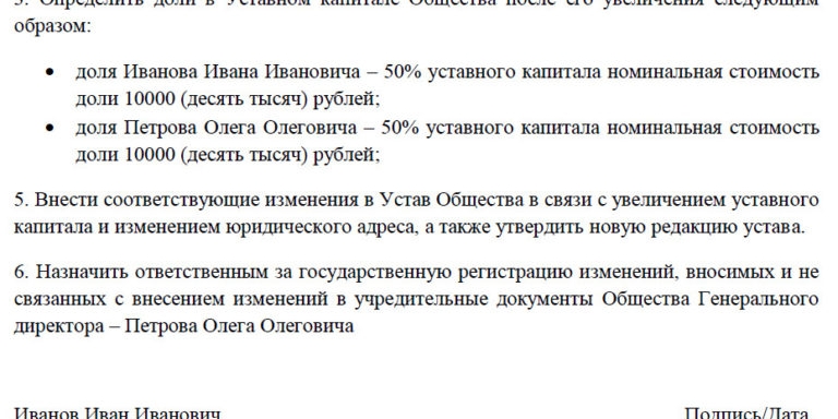 По вопросу о принятии в общество третьего лица созывается внеочередное собрание, по результатам которого составляется протокол. При этом все вопросы повестки дня (об увеличении уставного капитала, о принятии нового участника, об изменении размера долей участников) должны быть приняты единогласно. Если у компании один собственник, то вместо протокола оформляется решение единственного учредителя.
