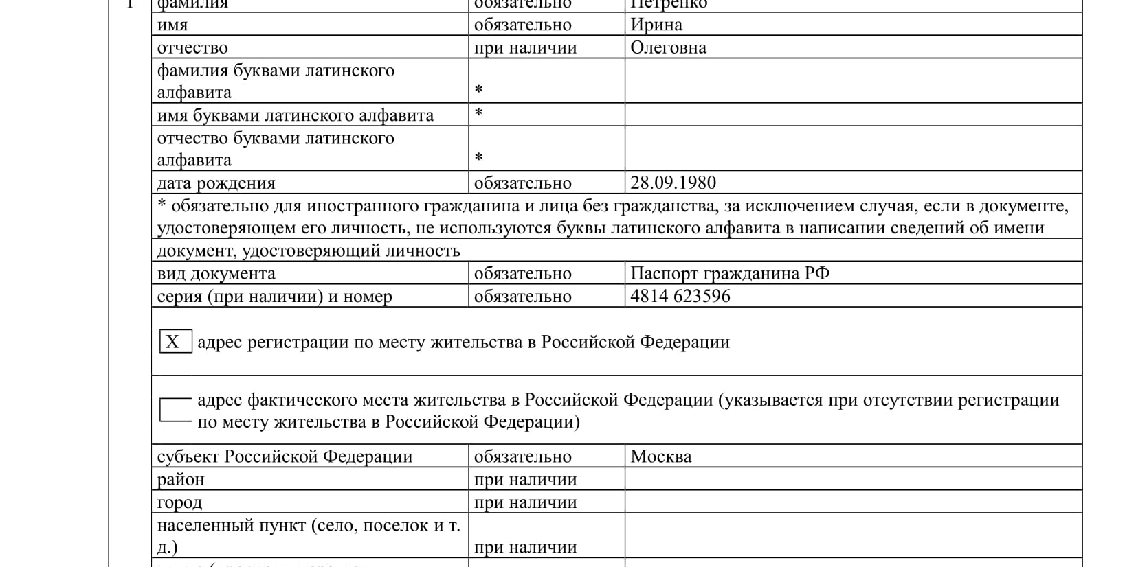 | Обязательно для иностранного гражданина и лица без гражданства, за исключением случая, если в документе, удостоверяющем его личность, не используются буквы латинского алфавита в написании сведений об имени. | |||